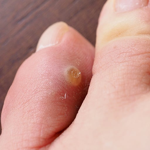 Like calluses, corns are thickened areas of skin that are usually hard and circular-shaped, with a polished or translucent centre, like the kernel of corn from which they take their name. They may become painfully inflamed in response to persistent excessive pressure or friction, or infected and ulcerated when they rub against one another.